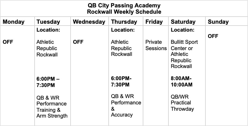 Two tracks run concurrently: Jr. Passing Academy for ages 6yrs to 11yrs and Varsity Passing Academy for ages 12yrs and Up.